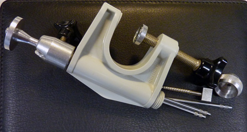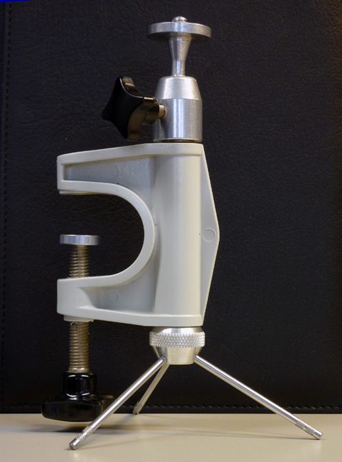 First I was just happy to have found a clamp, lightweight and small. But there is more to it. Remove the little screwtop and out come 3 tripod legs and a woodscrew.