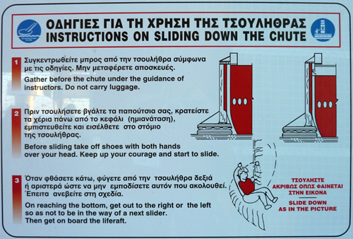 Looking for a way of dealing with the crisis I saw the above sign on the ferry. Since then I have been practicing taking my shoes off with my hands over my head and gathering my courage. I will keep you posted on the results.