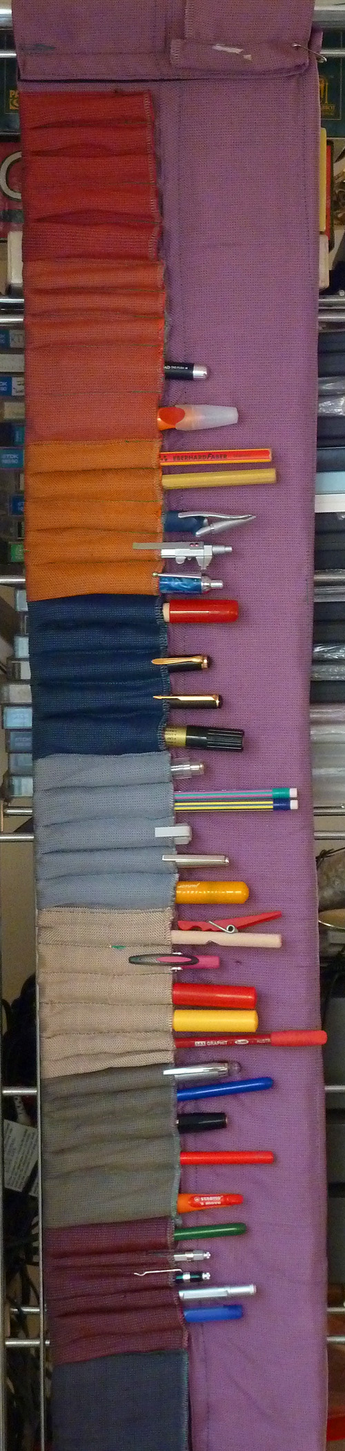 over Christmas a few new pens joined the collection and I finally sat down and made a pencil roll from some pure silk cloth samples I had picked up at a car-boot sale ages ago. Finally instead of just keeping the treasures rolled up I decided to hang the roll on our bookshelf.