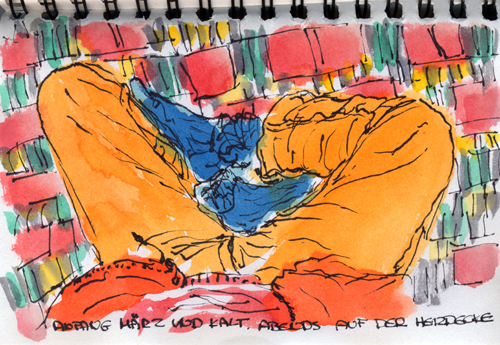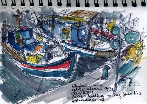 on the weekend I finally did venture outside after archery practice. Settled down to sketch some fishing boats. With my luck 5 minutes later the fishermen arrived, turned on the stereo in one of their cars full blast and started to get ready to go out to lay down some nets.