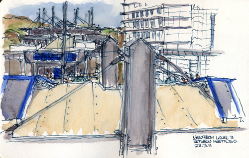 March 25, 2011 breaks at work Noodler’s blue black contract ink in my Pilot and lunch breaks must be used to sketch. Apron and in a landside core looking at the trainstation and hotel. 37.846586 23.772208 Share this: Click to share on Facebook (Opens in new window) Facebook Click to share on WhatsApp (Opens in new window) WhatsApp Like Loading...