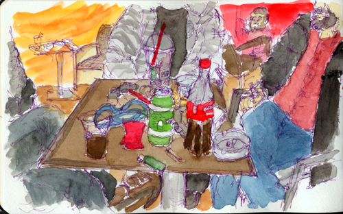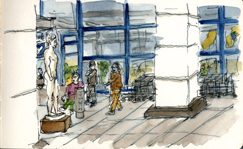 lunch break sketch. Only while sketching did I realize how funny it is to have a nude smiling man standing at the departures curbside. If you look closely you can see me in the reflection of the windows.