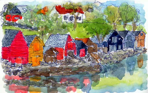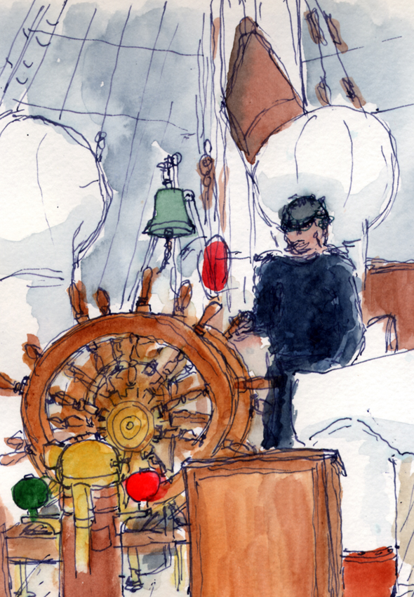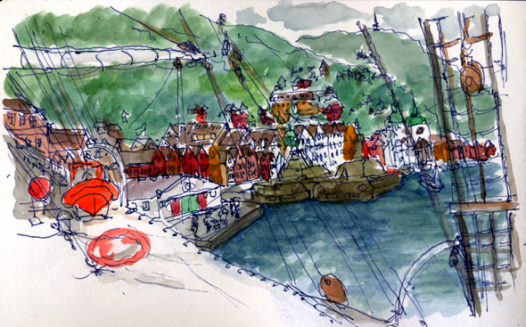 weekend trip to Norway over the weekend to attend a party. What a beautiful place, if only the weather was a bit better. Here are the sketches I did of the Bergen harbour front, some boat houses in a fjord and the steering wheel of the 3 master we took to get there.
