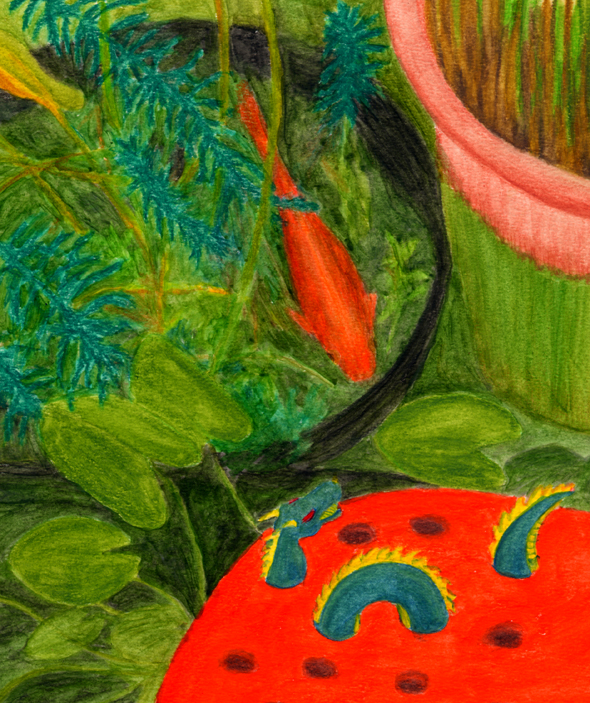depression over the country’s problems have overwhelmed me lately and the energy to sketch just was not there. We are all sitting like rabbits in the glare of headlights at night, stunned and waiting to get run over. However my goldfish Fritz is not worried even when meeting the Croc’s including dragon.