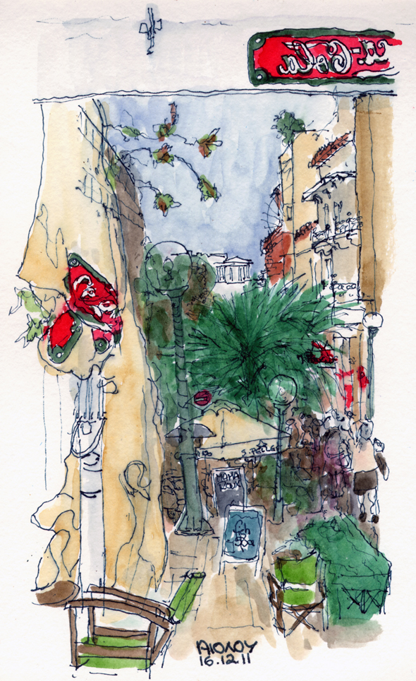 and today coffee again after some intensive christmas shopping on Aiolou street with a view of the Acropolis. All in glorious unchristmassy warm and sunny weather.