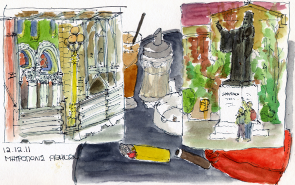 I had to take some days off without anywhere to go so I decided to continue exploring the Athens of old, here having coffee outside the Mitropolis which is still fully covered with scaffolding.