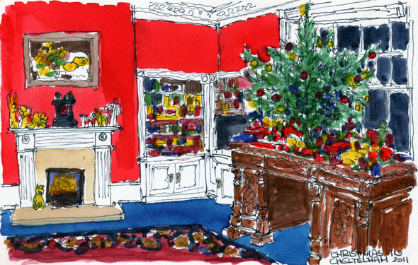 we had a very nice christmas in England this year, had planned on so many sketches outdoors but due to the weather could only sketch inside. Inge’s living room with tree and my favourite colour on all the walls.