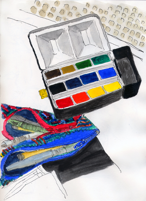 January 18, 2012 christmas gift a bit late I finally scanned this sketch of my favourite christmas gift, a Schmincke mini watercolour box including water bottle and tray. So here it is together with my water brushes and moleskin. 37.846586 23.772208 Share this: Click to share on Facebook (Opens in new window) Facebook Click to share on WhatsApp (Opens in new window) WhatsApp Like Loading...