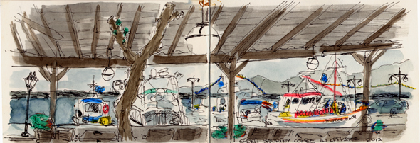 A great week spent in Karystos for the Easter week, no wind and perfect weather for gardening, fixing walls etc. Coffee with the neighbor on the harbour front.