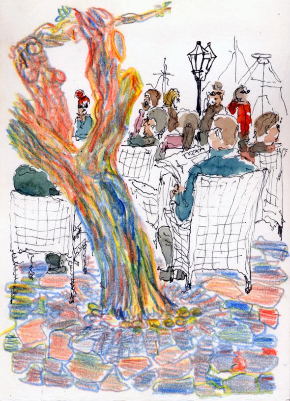 the mulberries are just starting to pop new leaves. My multicolour pencil came in handy, watercolour added at home.