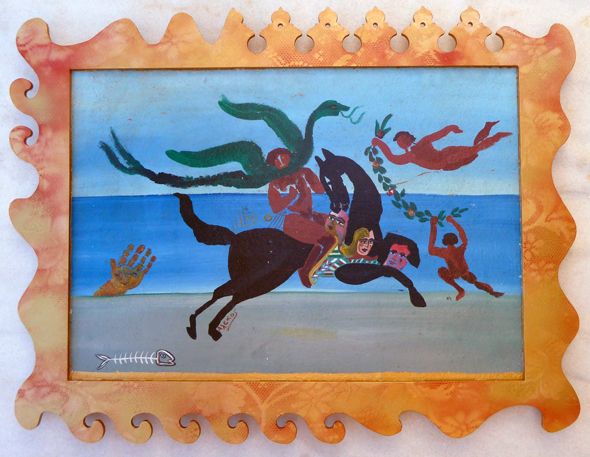 the painting was done by Alekos and shows me with my two good friends Dimitris and Jannis (the heads in the horse) and looking at it now, the faces are actually recognizable.