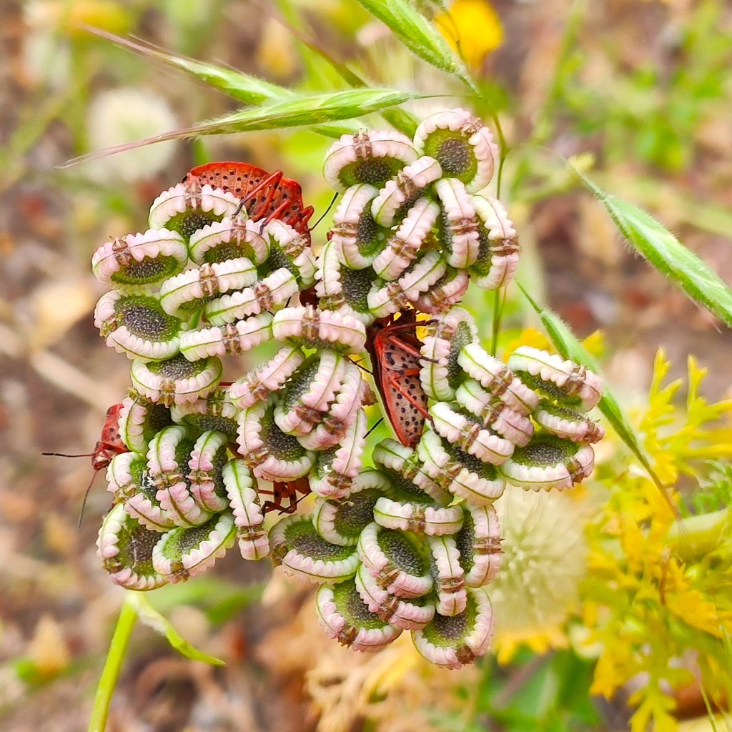Although I usually don’t post photos, here’s one I really like, a lucky snapshot from one of my walks. According to Google the bug is Graphosoma semipunctatum and the seedpods are from Tordylium apulum…..