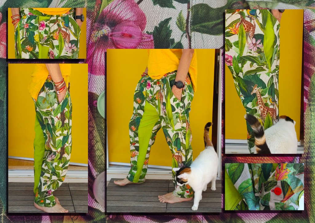 first time into town after the lock-down and I couldn’t resist this linen laser print material, combined with just a bit of upcycling an old lime green linen dress. The pattern was adapted from my favourite pair of trousers bought in 1976 in London.