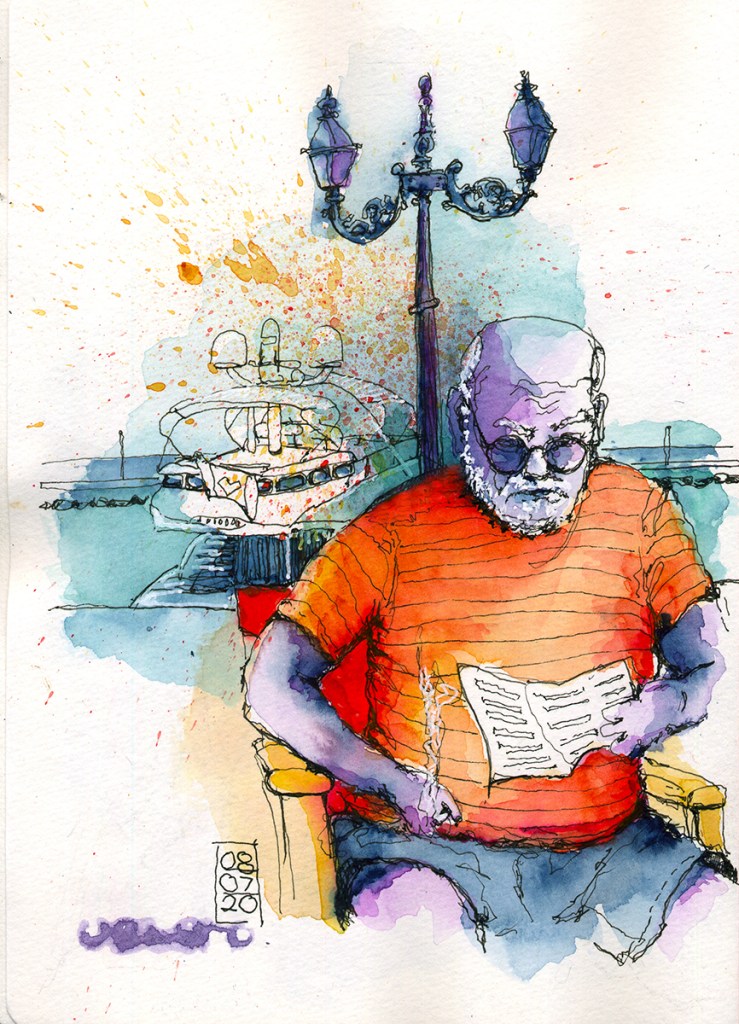 I’m doing a sketching workshop (bending reality) these days to acquire some new skills, promptly applied to our friend George on the weekend in Karystos.