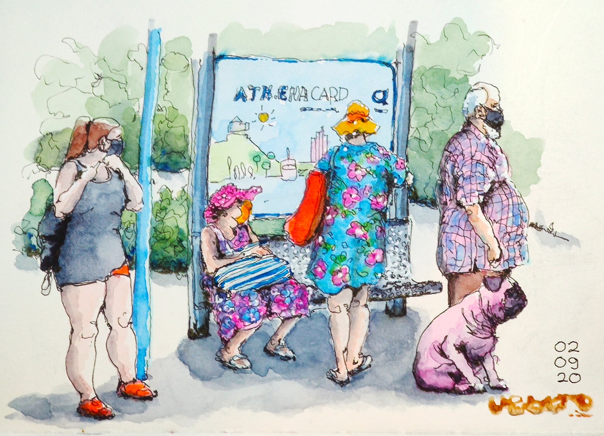 September 3, 2020 bus stop Ventured into Glyfada yesterday determined to sketch some people with masks and included some AR for good measure. Share this: Click to share on Facebook (Opens in new window) Facebook Click to share on WhatsApp (Opens in new window) WhatsApp Like Loading...