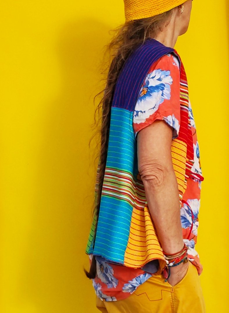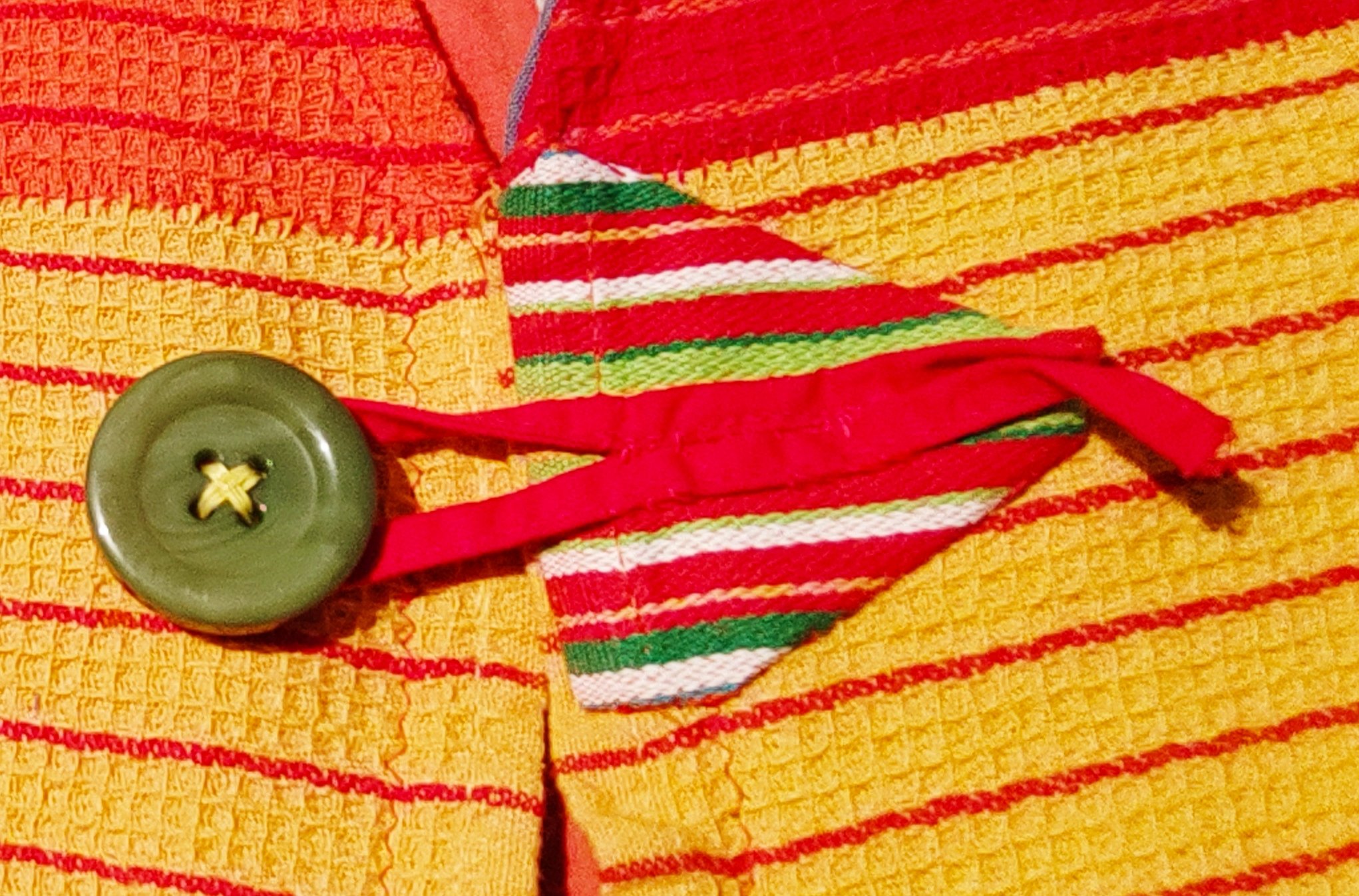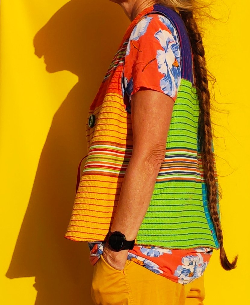 Picked up 6×1€ dishcloths at the farmer’s market last week because I was thrilled with the colours. I upcycled them together with my trusted lockdow-walks-with-big-pockets-waistcoat since that is what is needed again now and instead of drab blue-gray now it’s high-visibility.
