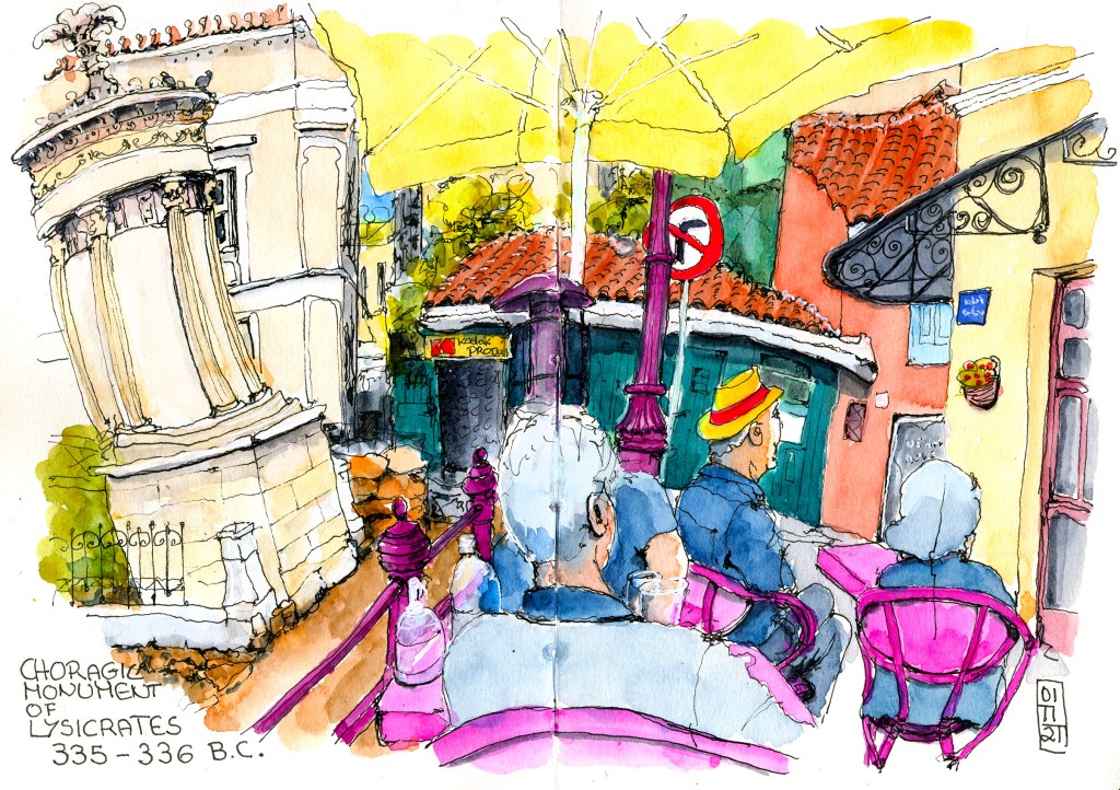 another walk downtown to the most touristy part of Athens where there are still more tourist than I remember for this time of year, had to bend the monument (erected to display the trophy for first price in a theater competition at the nearby Dionysos theatre) a bit to show more of the lovely green hovel that used to be a camera film shop (remember those? I do)