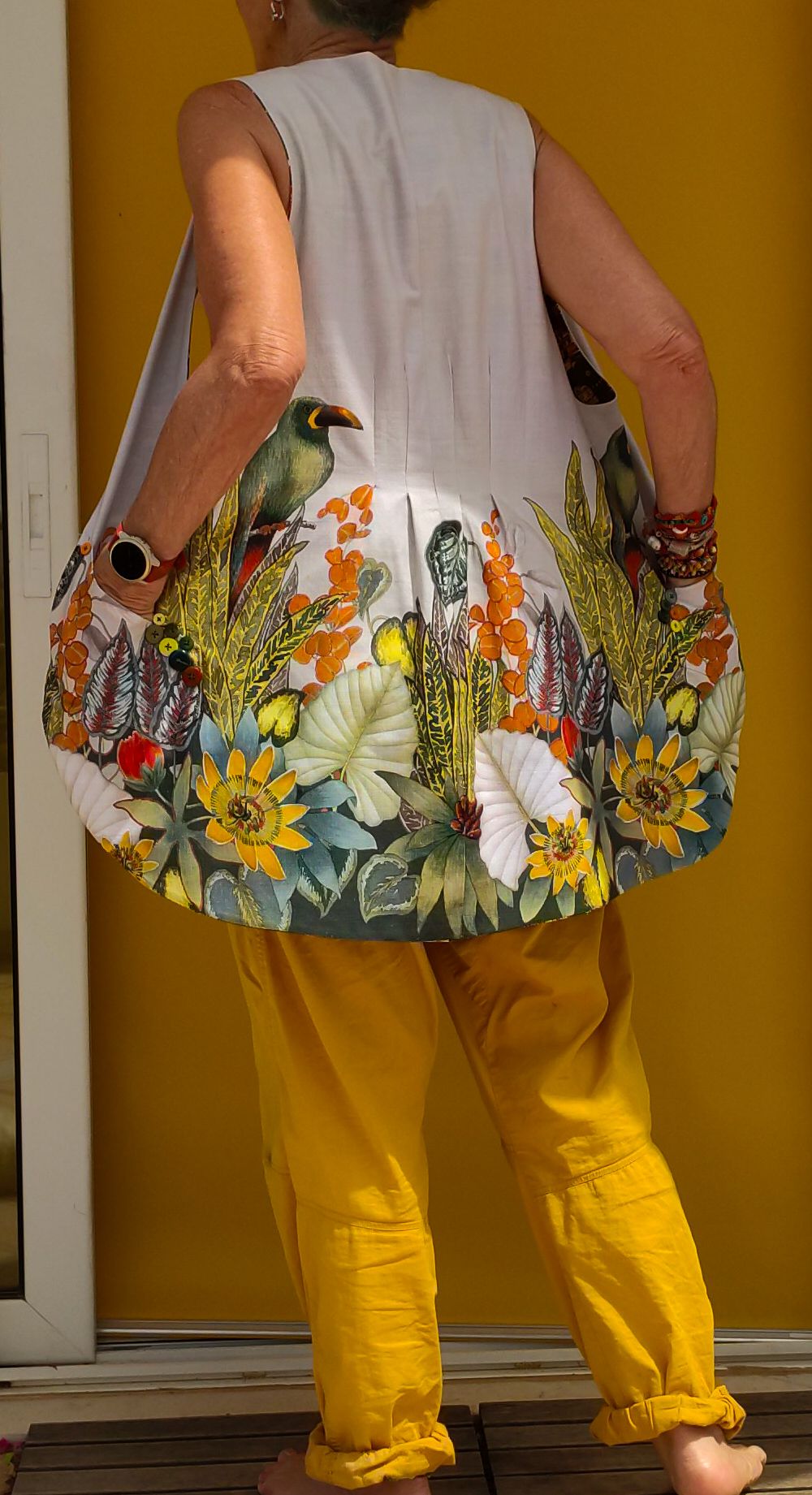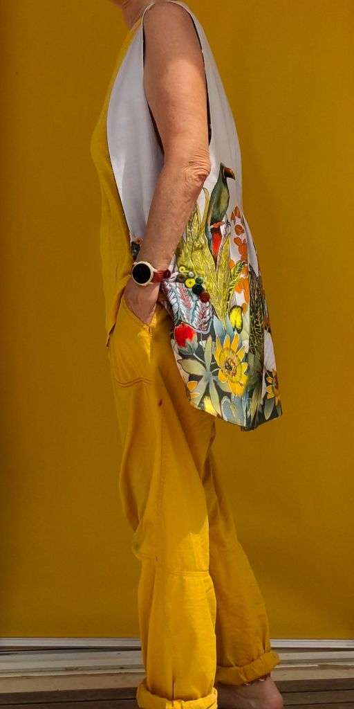 Found this amazing cotton table cloth material, improved by adding textile colours orange and red, with big pockets (main reason for wearing a vest).