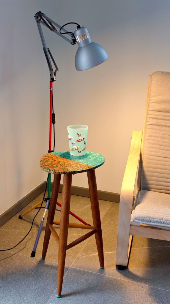 The lamp is part children’s music stand from a charity shop and an old office lamp.