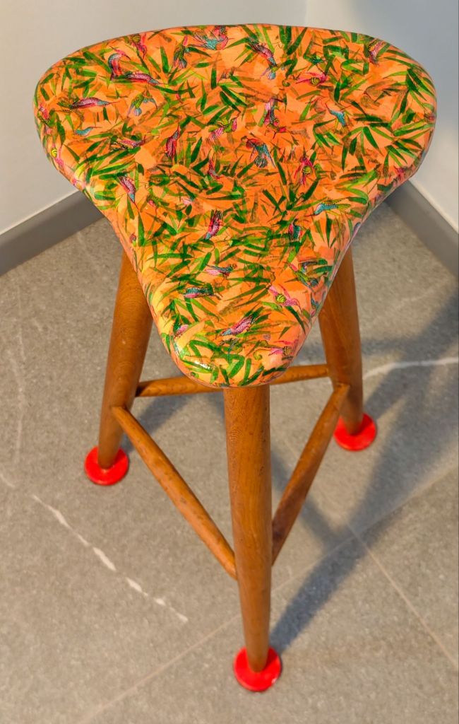 At the end of 2024 a friend let me have three carpenter made barstools from a 50′ apartment. They were impossible to sit on with their center of gravity much too high and the footprint too small, but lovely legs.