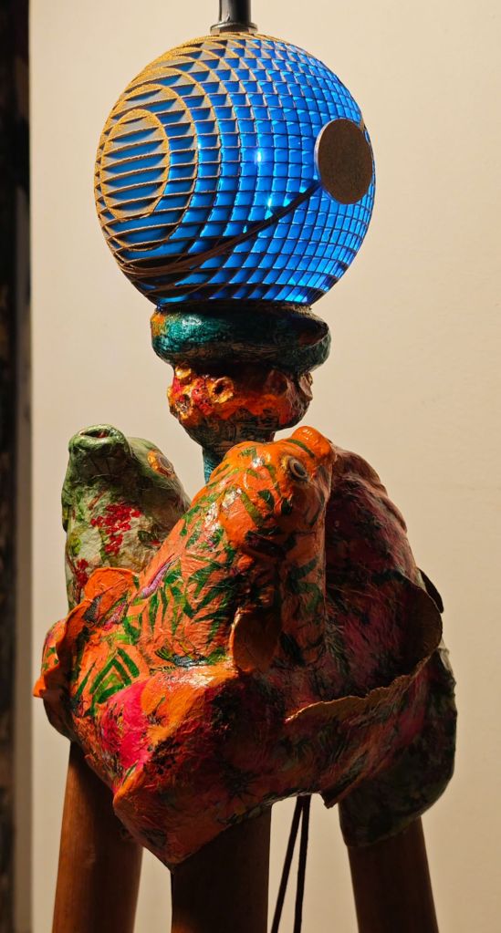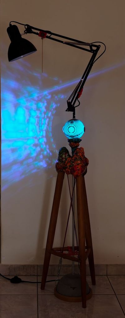 The last barstool turned out to be a rather elaborate project, including parts printed on my new (Christmas present) 3D printer (light globe, center pole triangle, electrical fittings), and cast cement half globe to keep it from taking off. On top of course the I*kea Anglepoise lamp.