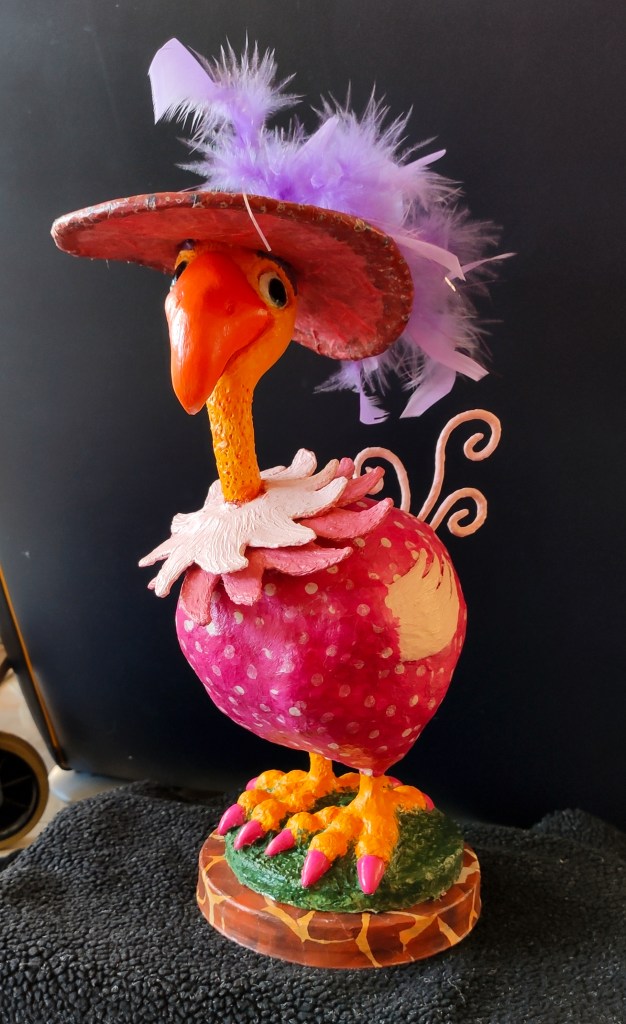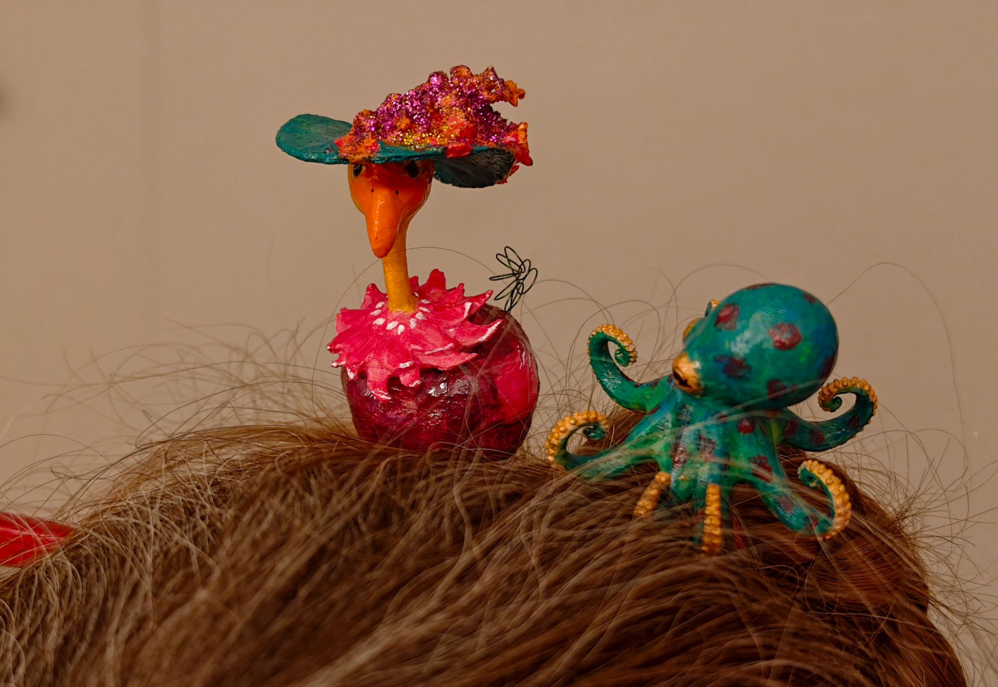 My first papier maché sculpture served as a trial object for an AI application that translates video into 3D mesh formats that can then be printed. So far I haven’t found a good tool to edit the mesh, so I just left it as is. The result was surprisingly good, so it got painted and mounted on a chop stick for another hair pin.